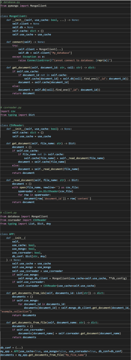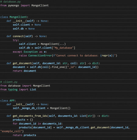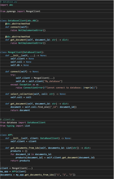 Imaginemos que nos piden realizar un módulo que sea capaz de leer de una base de datos MongoDB un listado de documentos para devolverlos como un diccionario. Hagamos 2 ramas del código, una utilizando Inyección de dependencias y otra sin ella.