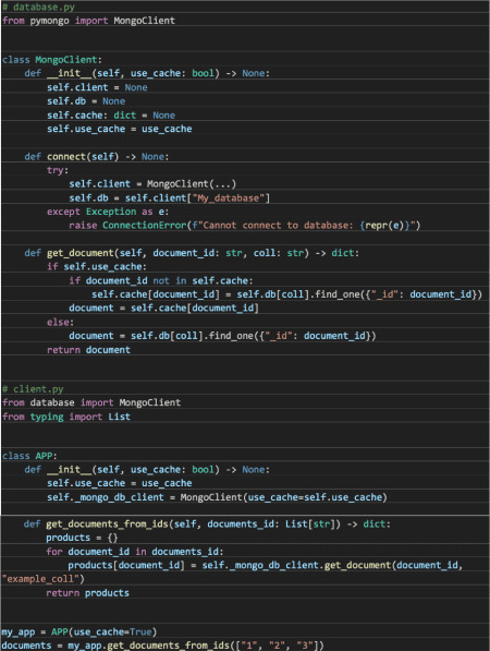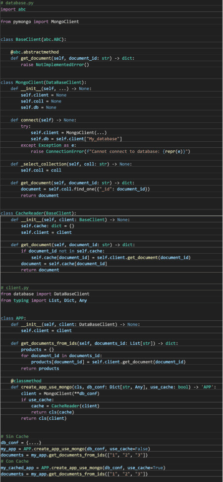 Podemos observar cómo MongoClient no ha cambiado nada. Por otro lado, el constructor de APP tampoco ha cambiad, ya que delegamos la instanciación y la lógica en un método de factoría que nos genera una APP que lee de una base de datos MongoDB con cache de forma opcional.
